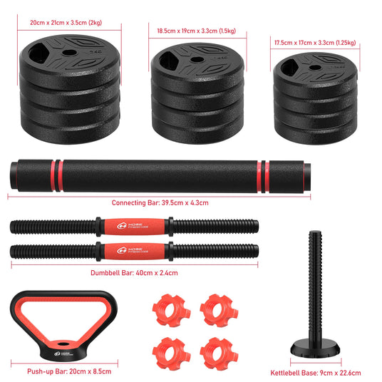 - Pakkaus sisältää: 2KG painolevy x4; 1.5KG painolevy x4; 1.25KG painolevy x4; käsipainotanko x2; liitostanko x1; punnerrustanko x2; käsipainopohja x1; painomutterit x4