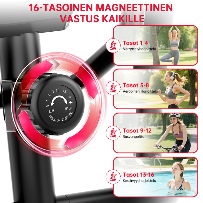 Siinä on 16 magneettivastustasoa, joiden avulla voit räätälöidä treenisi edistymisesi mukaan.