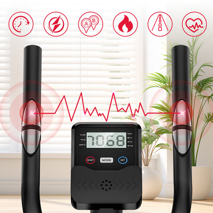 Digitaalinen näyttö pitää sinut ajan tasalla treenin mittareista, kuten ajasta, nopeudesta, matkasta, kaloreista ja sykkeestä.