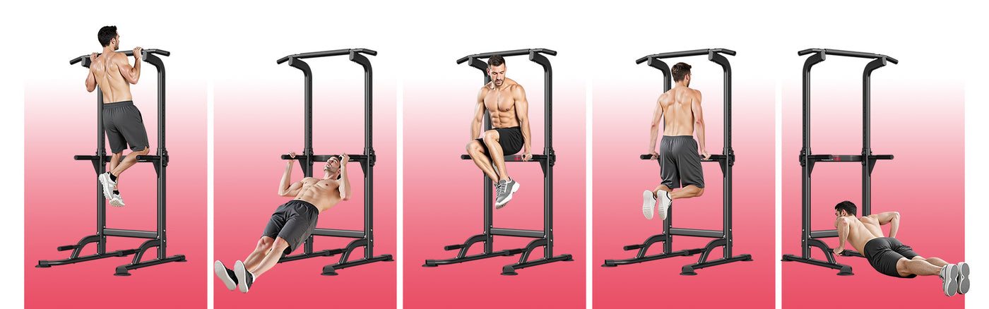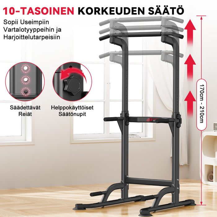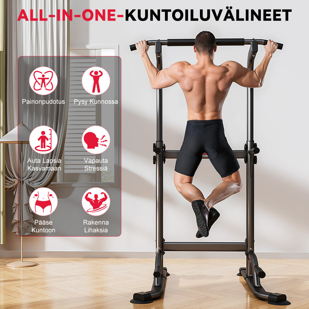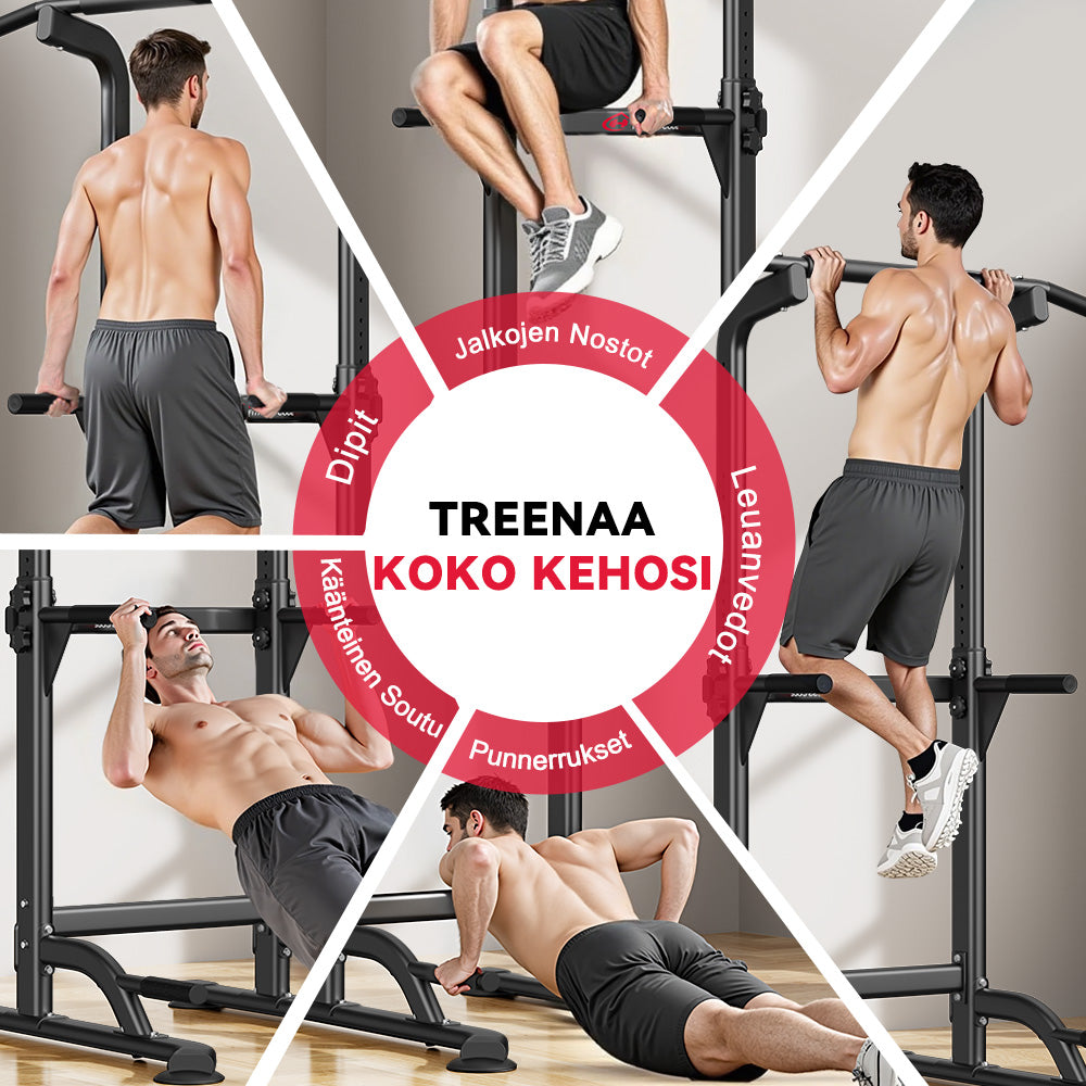 Voit tehdä leuanvetoja, punnerruksia, dippejä, treenata käsivarsia, selkää, vatsalihaksia tai jalkoja – kaikki tällä voimatornidippiasemalla.